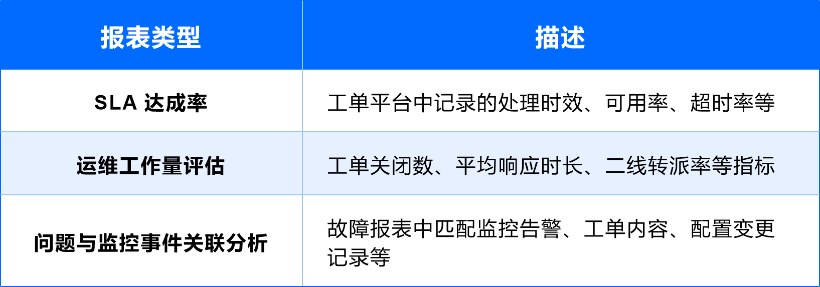 目标:支撑 SLA 报表、运维服务绩效报表、问题复盘。