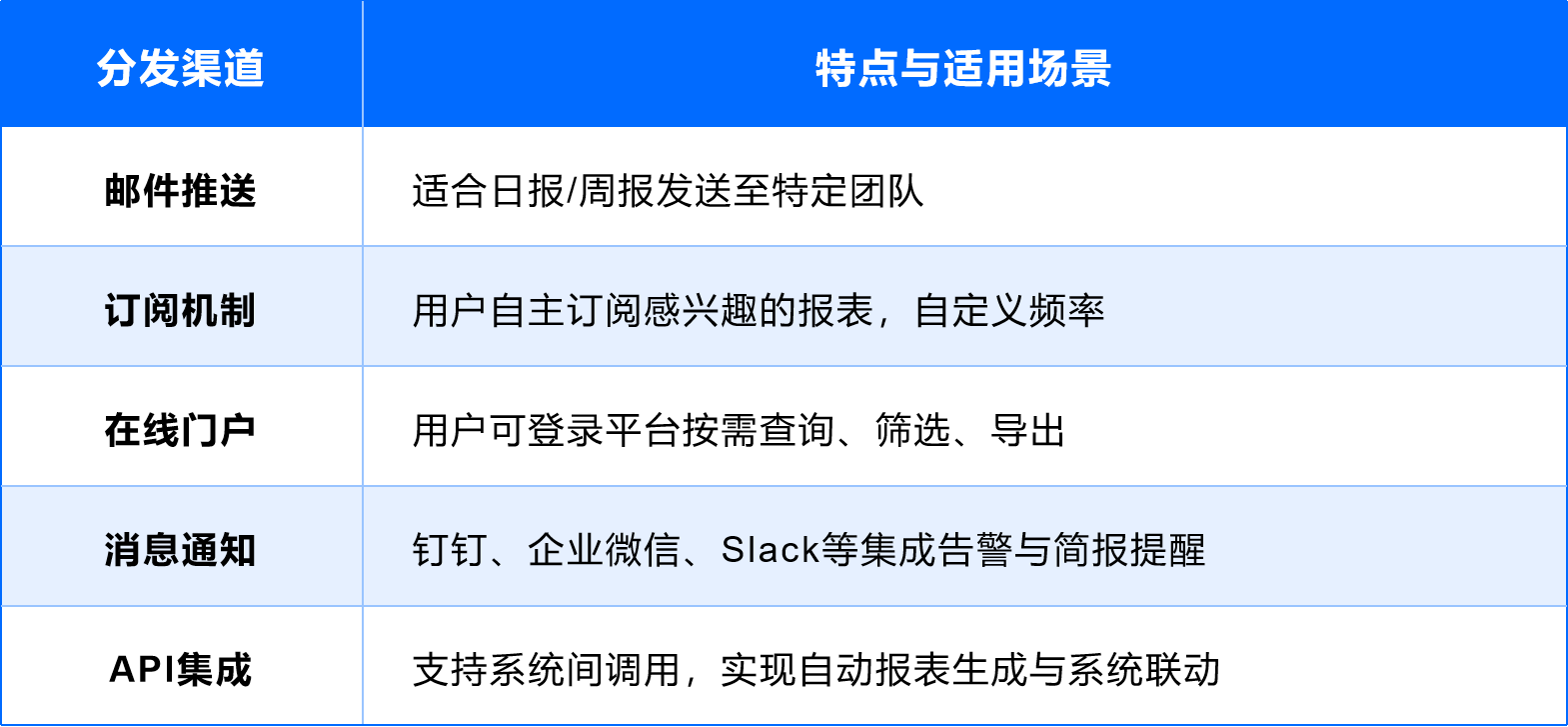 高效的报表体系需支持“送达目标人”+“送达目标方式”的组合策略,实现主动推送、被动获取与多终端分发。