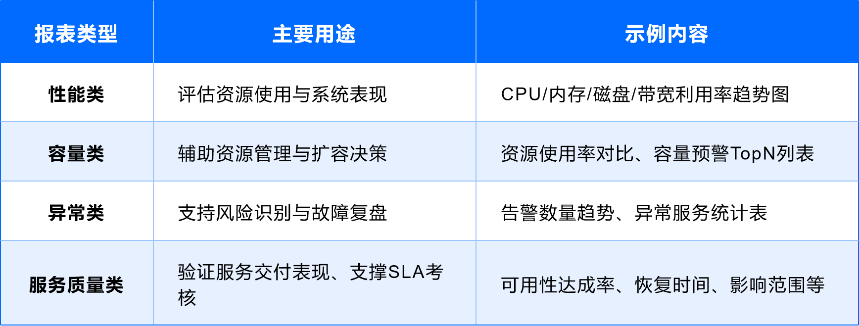 监控报表的本质,不只是对历史数据的汇总呈现,而且是通过结构化、可读性强的分析内容,赋能各类运维、管理与审计角色,完成对系统运行状况的洞察、评估与优化。优秀的报表体系,应该围绕“帮助人决策”这一核心目标进行设计。本章将从四个关键价值维度展开分析。