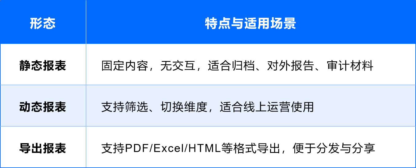 格式不仅决定报表的可读性与可操作性,也直接影响其落地方式(在线查看、导出、邮件投递等)。