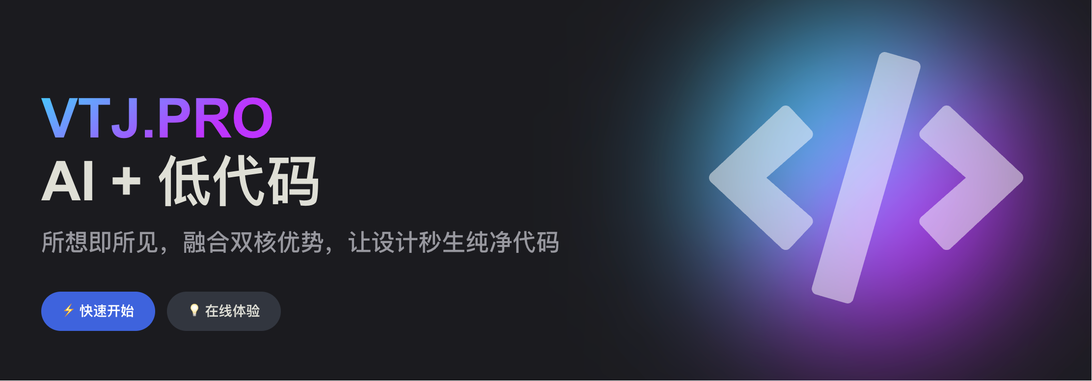◼️ VTJ.PRO:AI赋能与代码自由的双重优势 VTJ.PRO 的突出特点是 “双向代码自由穿梭” 和 “AI深度赋能” 。它不仅允许通过可视化设计生成高质量的 Vue3 代码,还能将手写的 Vue 代码反向解析为低代码 DSL 进行可视化调整,真正做到了源码的自主可控。其集成的 AI 能力(文生代码、图生代码、代码检测与修复)能显著提升开发效率和质量。它非常适合复杂企业级应用、需要快速迭代且对代码质量和自主性要求高的项目,特别是团队技术栈以 Vue 为主的情况。