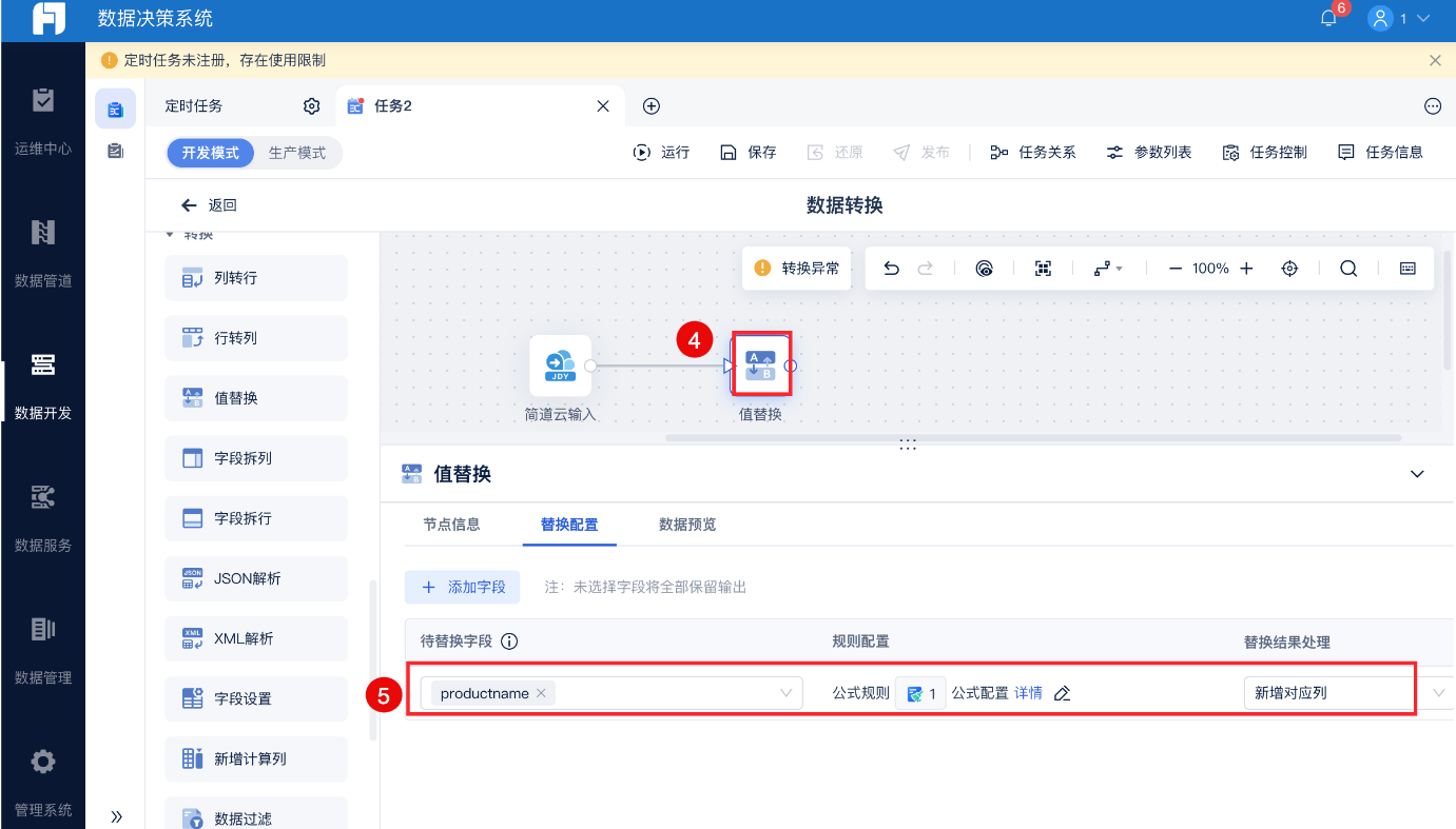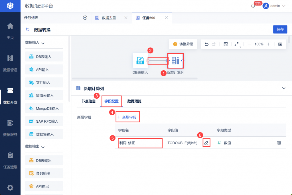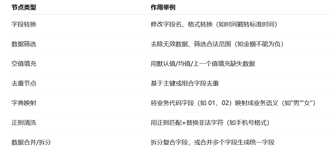 可以像画流程图一样拖节点,构建完整的数据清洗链路,支持: