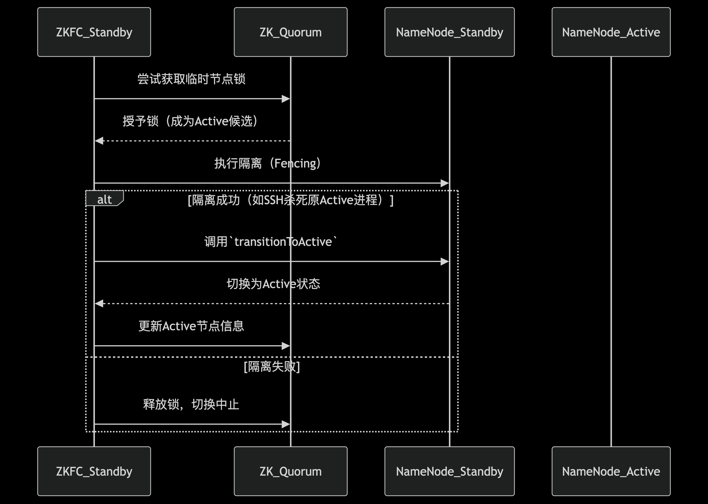当需要进行主备切换时,ZKFC通过ZooKeeper实现了一个高效的选举算法。所有健康的Standby NameNode都会尝试在ZooKeeper上创建同一个临时节点,由于ZooKeeper的强一致性保证,最终只有一个客户端能够创建成功。这个成功的ZKFC随即将其监控的NameNode提升为Active状态。