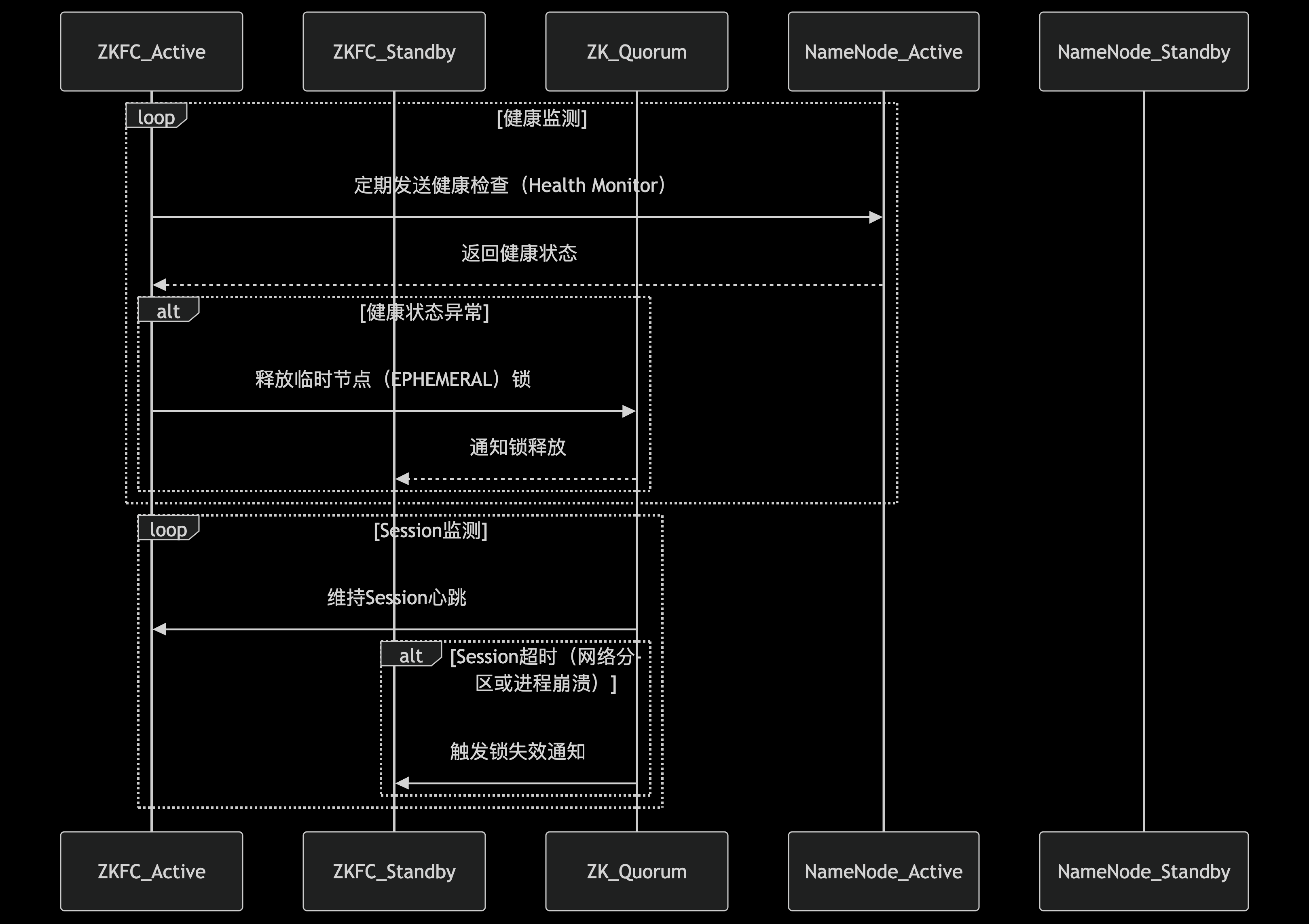 第三个组件ZKFailoverController作为总协调者,负责处理来自HealthMonitor和ActiveStandbyElector的事件通知,并根据预设策略决定是否触发故障转移。这种模块化设计使得系统各部分的职责清晰明确,便于维护和扩展。