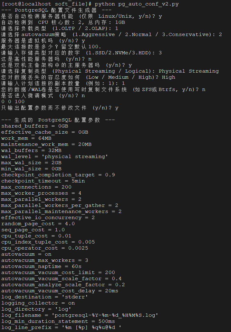 运行工具:执行python3 pg_auto_conf_v2.py,根据提示开始交互;