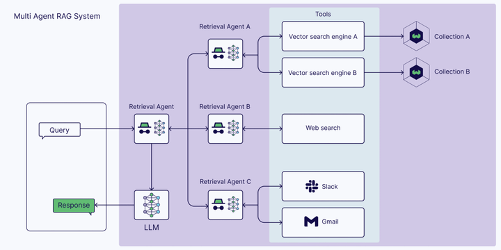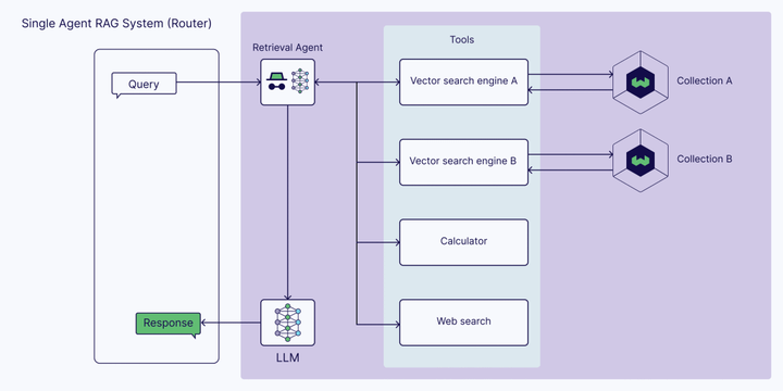 - 单智能体RAG:作为路由器,从多个知识源(如专有数据库或API)检索数据。
