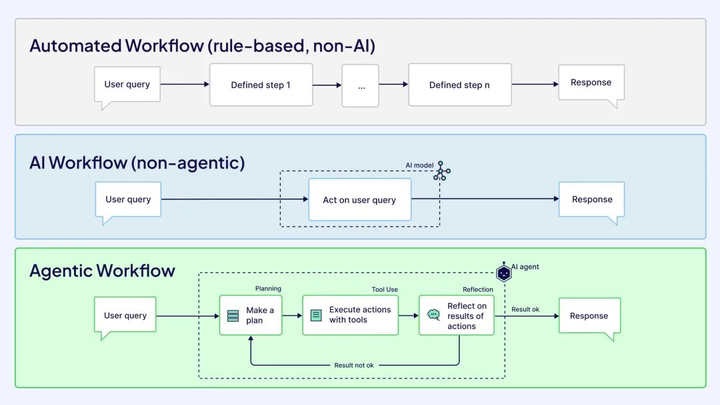 - 与传统工作流的比较:确定性工作流(如费用审批规则)缺乏适应性;非智能体AI工作流(如文本摘要)仅静态生成输出;而智能体工作流整合LLM、工具和记忆,实现响应式演进。