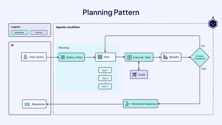 - 规划模式(Planning Pattern):智能体将复杂任务分解为子任务(任务分解),提高问题解决效率。例如,研究助理智能体分解主题研究为数据检索、分析和报告生成。该模式适用于高不确定性任务,但可能降低结果可预测性。
