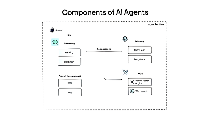 AI智能体是集推理(Reasoning)、工具(Tools)和记忆(Memory)于一体的系统。它利用LLM的动态决策能力,在有限人类干预下完成任务。以下是三大组件的详细说明: