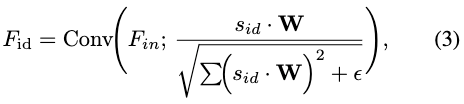 其中 表示卷积权重,该分支在不进行任何身份特定变换的情况下处理输入特征图 。 2) 调制卷积分支:我们首先用身份编码 调制原始卷积权重 ,随后通过解调稳定所得权重。该统一过程可表述为:
