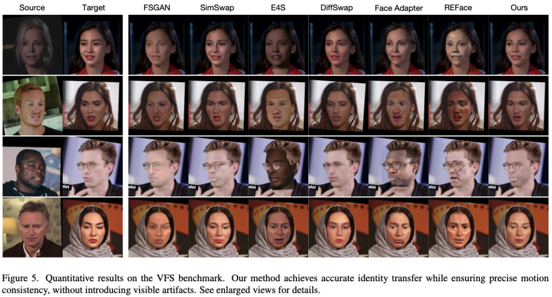 为进一步评估CanonSwap的有效性,在FF++和VFS基准测试上进行了定性比较,如下图4和图5所示。结果表明,本文的方法不仅实现了准确的身份转移,还保持了精确的运动对齐。