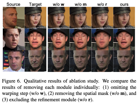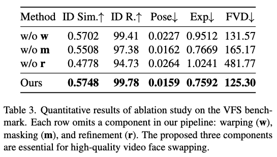 在VFS基准测试上进行了消融实验,以评估管道中每个模块的影响(见下表3和图6)。具体而言,分别移除了三个组件:(1) 无w(w/o w)省略了变形步骤,直接在原始空间进行人脸交换;(2) 无m(w/o m)移除了软空间掩码,导致整个特征图的全局调制;(3) 无r(w/o r)排除了在变形回之前增强规范空间特征的细化模块。如表3所示,移除任一组件均会导致多个指标的性能下降。图6进一步定性展示了这些问题:w/o w无法准确对齐姿态和表情,w/o m引入了更多不希望的纹理,而w/o r则导致模糊或不一致的身份细节。这些结果表明,所有三个模块对于实现视频人脸交换中的准确身份转移、精确姿态对齐和无伪影结果至关重要。
