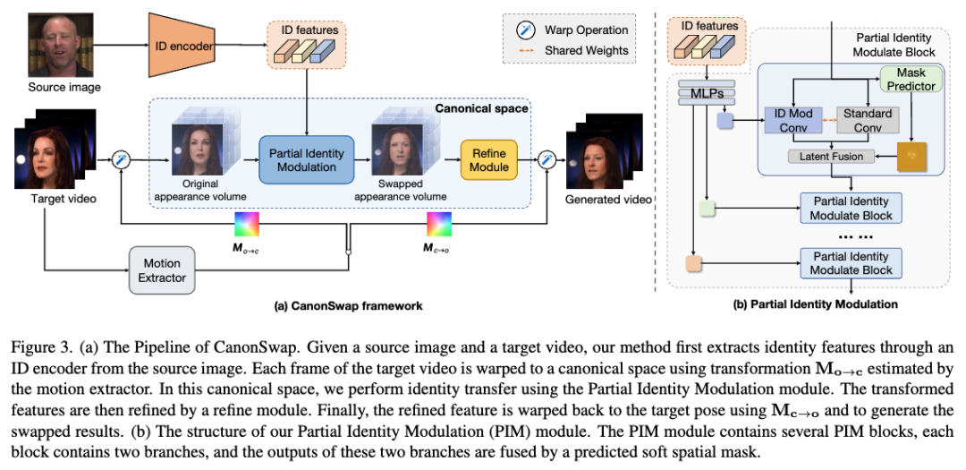 本文的方法概念如下图2所示。给定输入视频,我们首先将其从原始空间变形(warp)至规范空间(canonical space)。在规范空间中,人脸仅保留外观信息,并固定为一致的姿态。随后,我们在该规范空间内执行换脸,并将结果变形回原始空间。得益于运动与外观的解耦,CanonSwap可在视频帧间实现高度一致且稳定的换脸结果。
