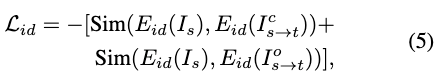 为确保准确的身份迁移,在规范空间和原始空间都采用了身份损失。该损失利用预训练的人脸识别模型来衡量交换后的人脸与源身份之间的相似度: