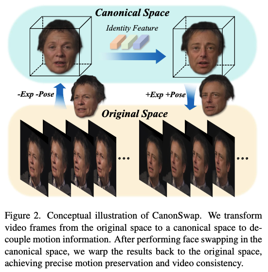 直接在原始空间换脸通常会因外观与运动的耦合导致意外的外观和运动变化。为解决此问题,我们提出构建一个解耦运动与外观的规范交换空间,并在该空间内进行换脸。换脸结果随后被变形回原始空间,从而保留动态属性并确保一致性。