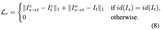 重建损失 用于确保当源图像和目标图像属于同一身份时的保真度。在训练过程中,以0.3的概率随机采样具有相同身份的源-目标对。重建损失公式为: