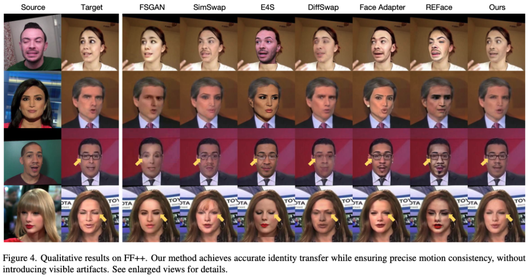 其中 ,,。这一综合损失函数使我们的模型能够实现具有运动一致性和清晰身份迁移的高质量换脸效果。