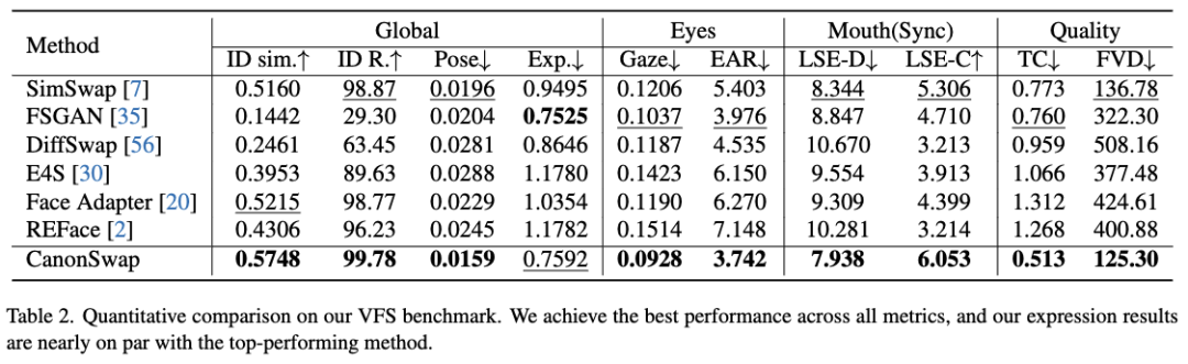 本文使用两个不同的测试集评估本文的方法:FF++数据集和我们的VFS基准测试。在FF++上,遵循常规的人脸交换评估协议,采用五个既定指标:ID检索、ID相似度、姿态准确度、表情准确度和Fr ́echet Inception距离(FID)。ID检索和相似度使用人脸识别模型通过余弦相似度计算。姿态准确度通过估计姿态与真实姿态的欧氏距离衡量,而表情准确度则通过对应表情嵌入的L2距离计算。