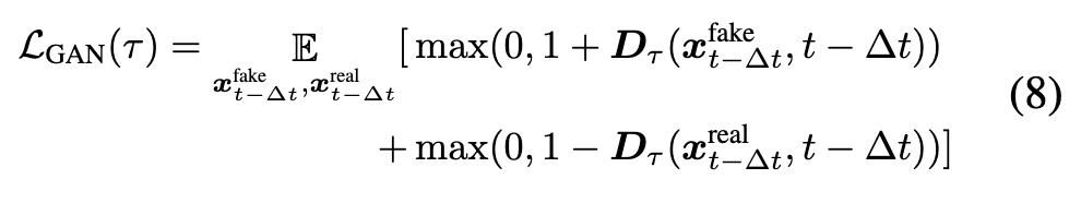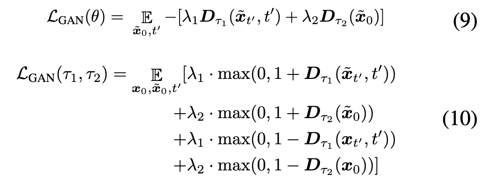 本文设置一个固定的时间步间隔(默认为)并求解关于的PF-ODE,从而可以得到伪造样本和真实样本作为分数预测输入判别器。判别器从冻结骨干层分层聚合特征,并通过多个可学习头部动态加权,建立了一种利用扩散先验和数据驱动可训练动态的自适应差异度量。使用Hinge损失交替训练生成器和判别器。这使得伪造分数预测更接近真实分数预测: