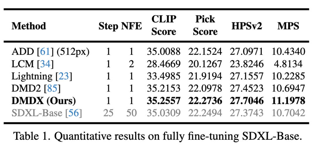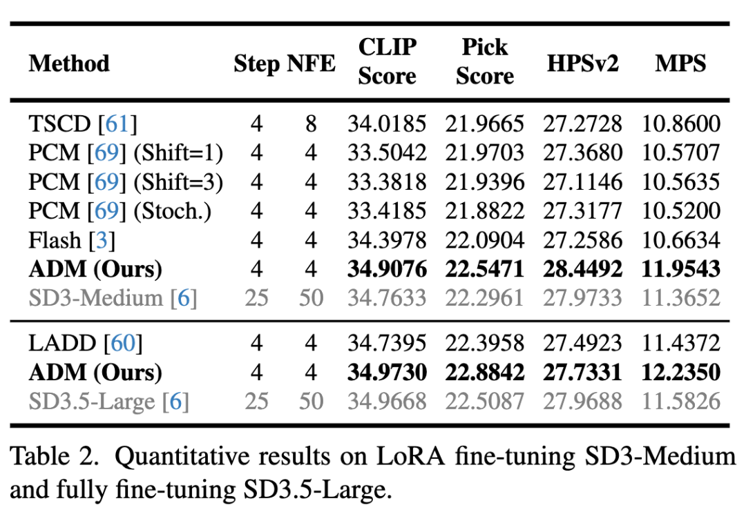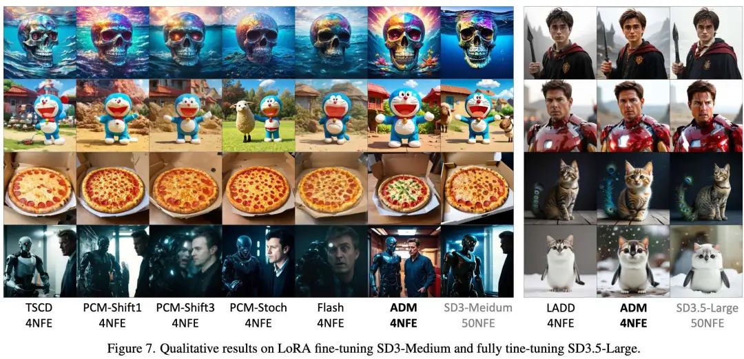 对于多步ADM蒸馏,其可作为独立的分数蒸馏方法。本文尝试了全参数微调和LoRA微调配置,下表2的定量结果证明了本文方法的优越性能。