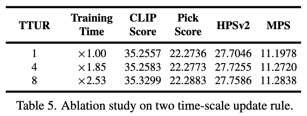 TTUR的影响。下表5展示了不同TTUR设置对最终性能和训练时长的影响。结果表明,增加TTUR仅带来微弱的性能提升,却使训练时间近乎翻倍,这种权衡显然得不偿失。这凸显了本文提出的ADP在一步蒸馏中的关键作用,同时表明DMD2中的训练不稳定性很可能源于支持集重叠不足。