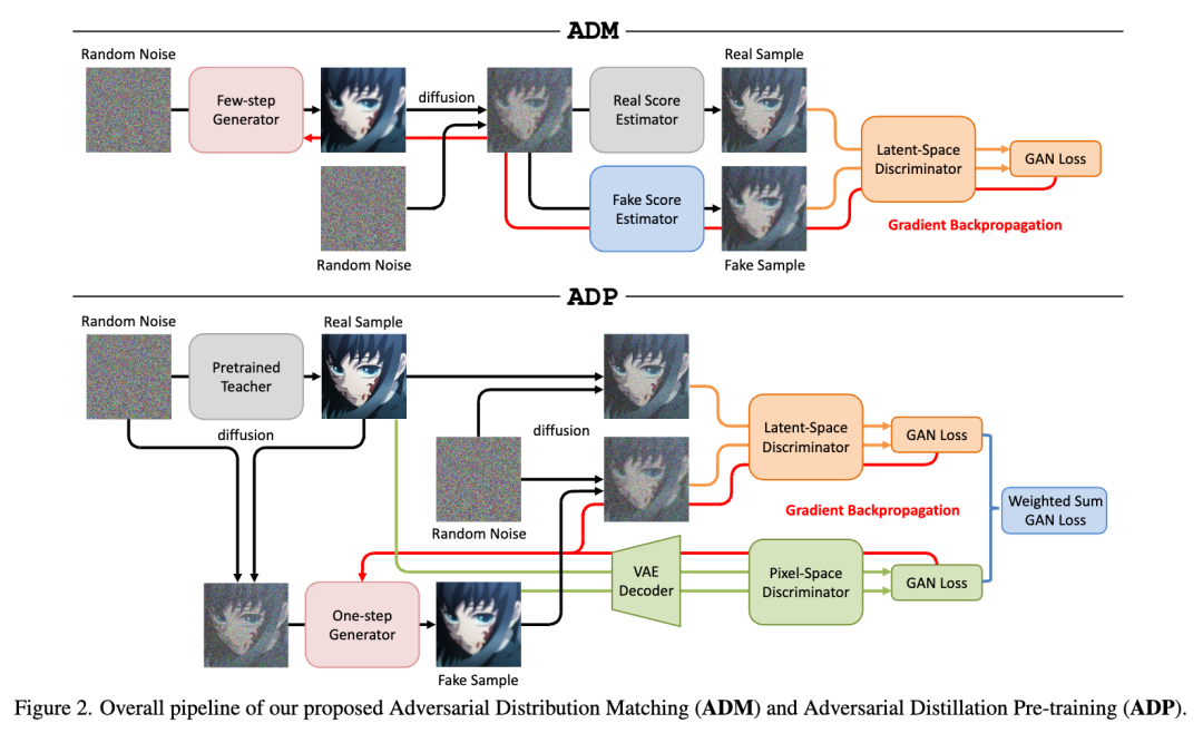 对合成数据进行对抗蒸馏的动机受LADD启发,但存在多处不同:1)通过Rectified Flow风格的ODE对而非随机噪声构建噪声样本;2)开发了促进确定性欧拉采样的三次方生成器时间步调度;3)引入额外的像素空间编码器以增强判别器能力并发现更多模式。