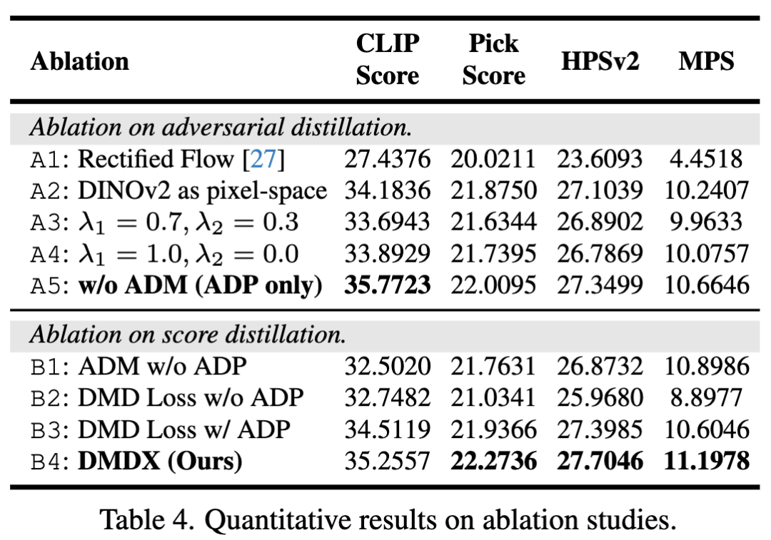 模型。对于一步蒸馏,在SDXL-Base上同时采用对抗蒸馏预训练(ADP)和ADM微调,称为DMDX。对于多步蒸馏,我们仅在文生图模型SD3-Medium、SD3.5-Large和文生视频模型CogVideoX-2b、CogVideoX-5b上使用ADM训练。遵循多数同期工作,我们未在文生图模型中使用无分类器引导(CFG),但在文生视频模型尝试了CFG集成实验。