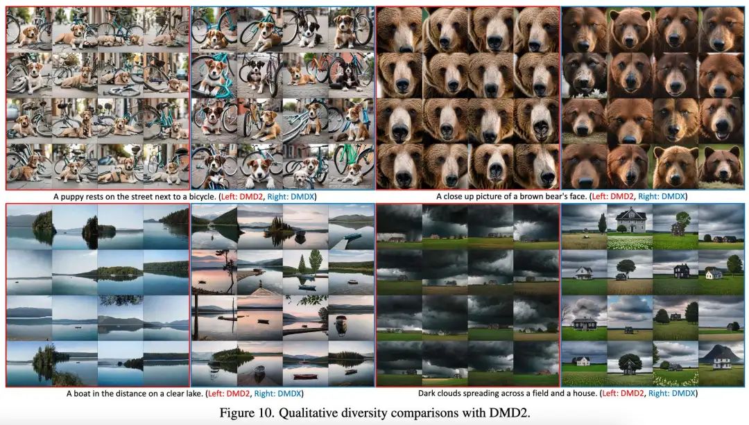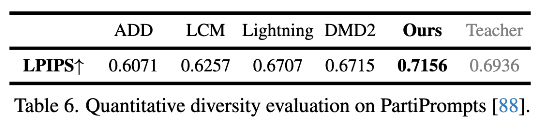 多样性评估。遵循DMD2的方法,在Partiprompts上为每个提示生成4个不同种子的样本,并在下表6中报告平均成对LPIPS相似度。结果表明,本文的方法在多样性方面显著优于其他方法。