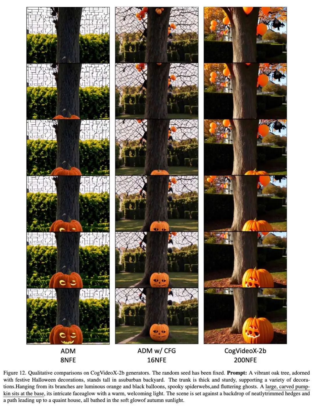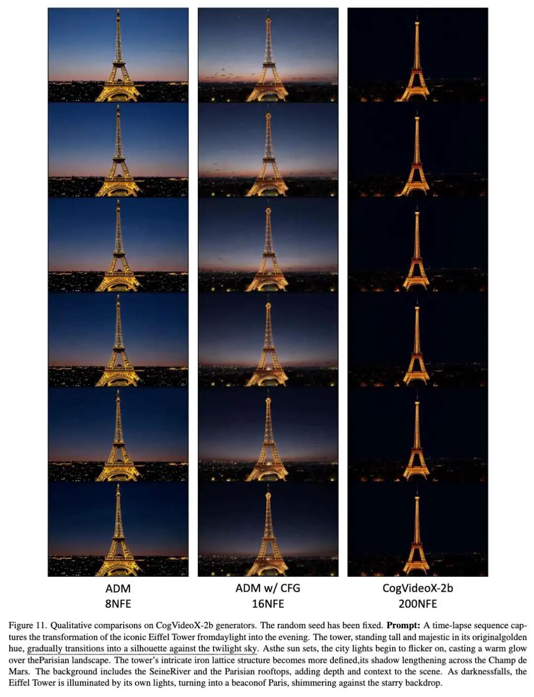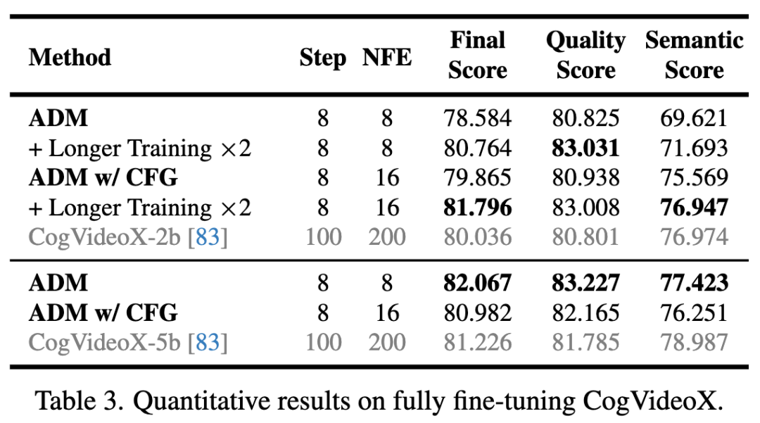 如下表3所示,除对CogVideoX两种规模常规进行8步ADM蒸馏外,我们还尝试在文生视频任务中集成无分类器引导(CFG):