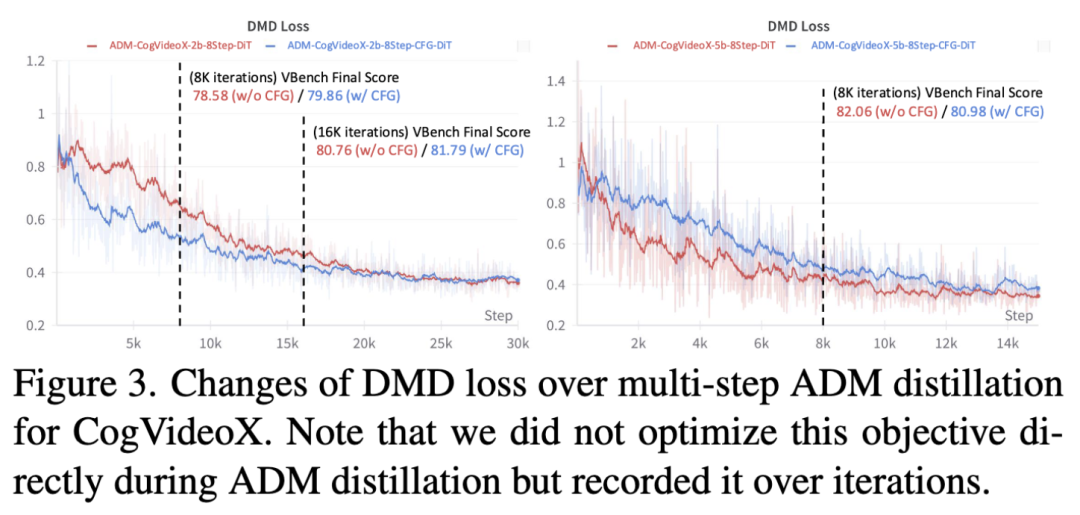 直观上,可学习的判别器可以近似任何非线性函数来隐式测量分布差异,这可能天然包含了DMD损失中的反向KL散度。如下图3所示,在CogVideoX的多步ADM蒸馏过程中可视化了公式(6)中DMD损失的变化。尽管未直接优化公式(6),结果显示出非常稳定的下降趋势,支持了我们的假设。