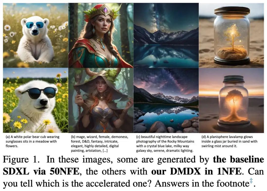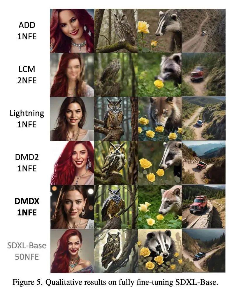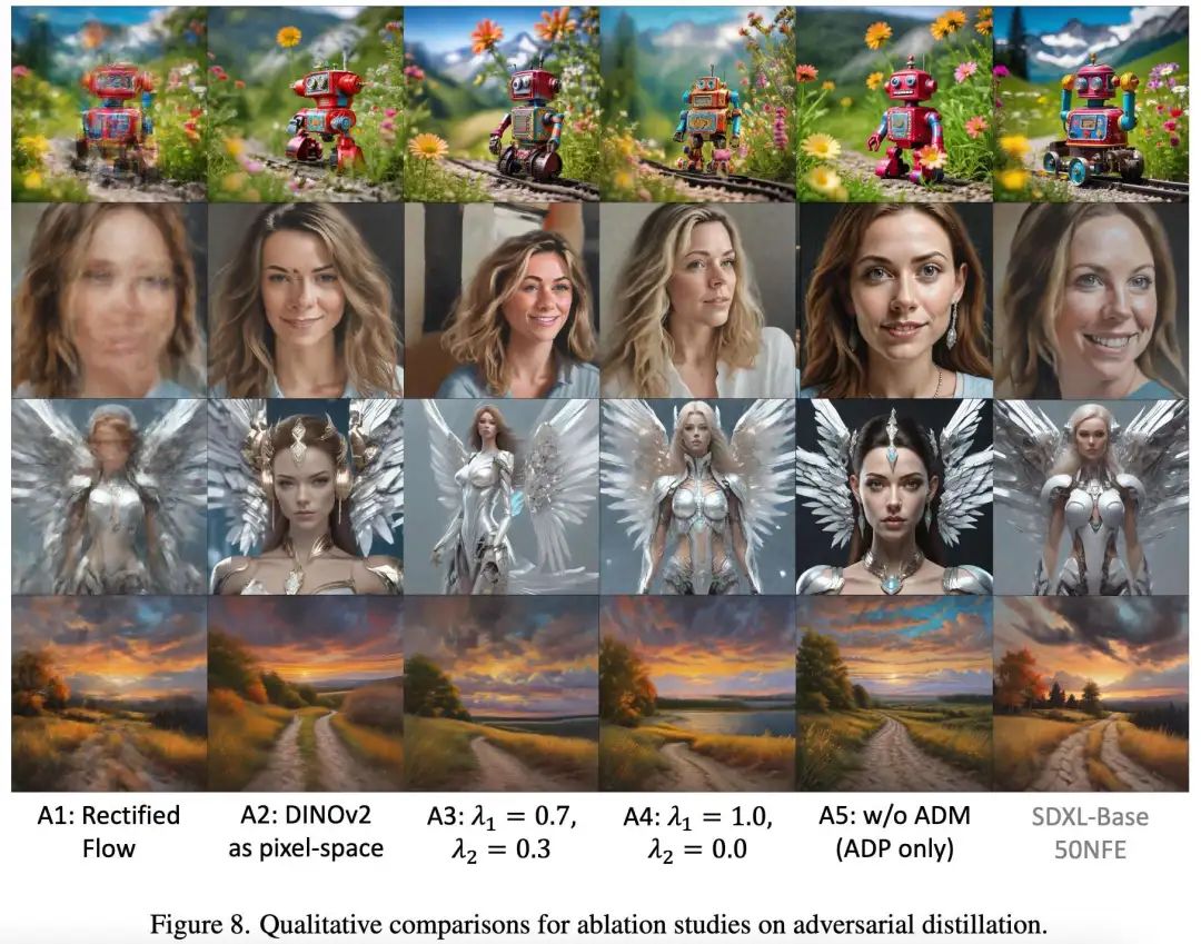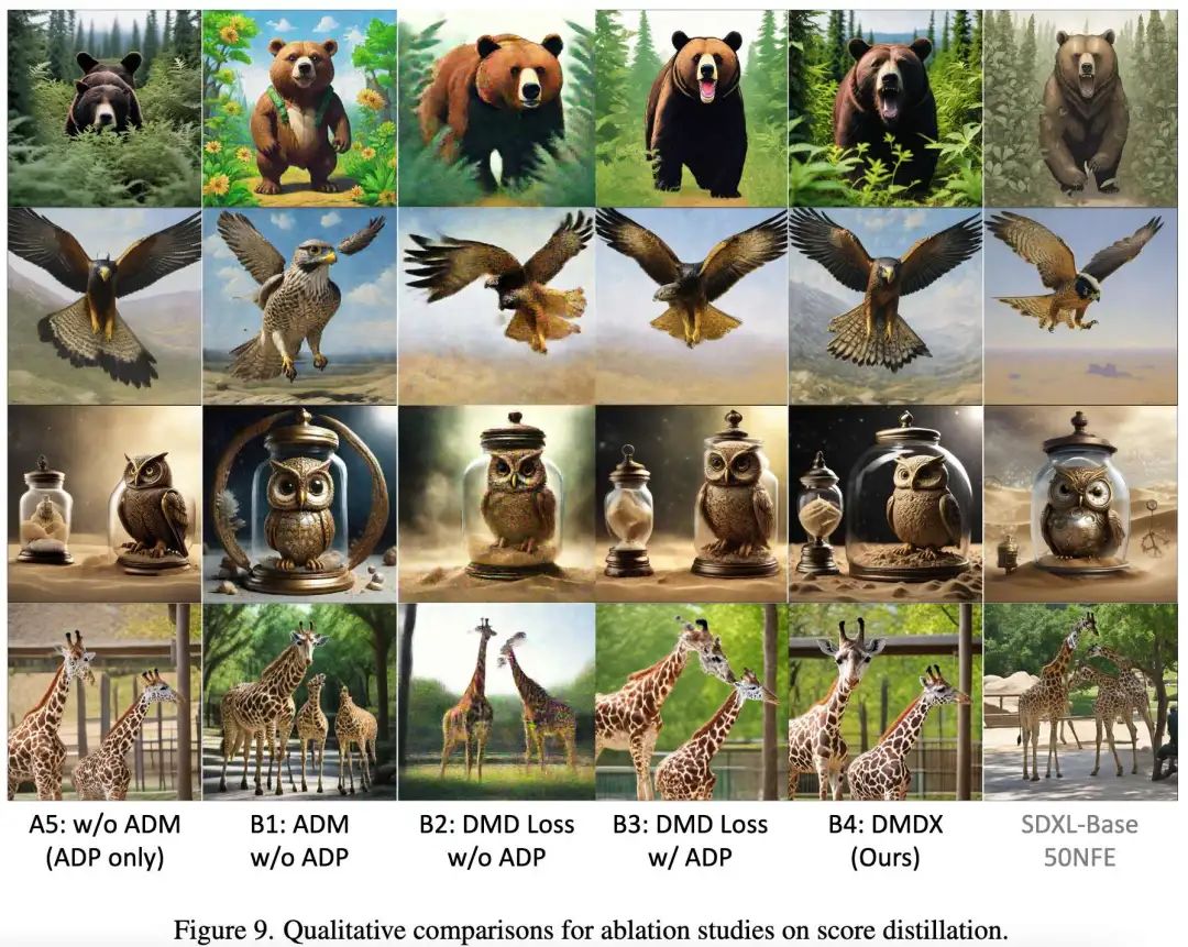 下表1定量比较了嗯问在SDXL-Base上结合ADP与单步ADM蒸馏的两阶段方法与现有一步蒸馏方法。结果显示,本文的方法在图文对齐度和人类偏好上均取得优异表现,这与下图5的定性比较一致(包括更好的人像美学、动物毛发细节、主体-背景分离和物理结构)。