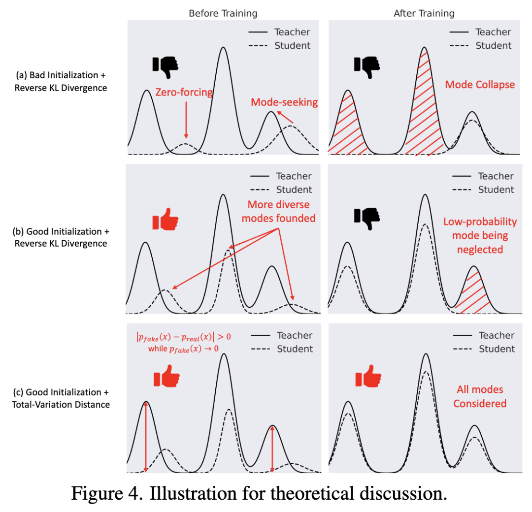 为了缓解DMD损失中的模式崩溃问题,DMD和DMD2分别额外使用了基于ODE的正则器和基于GAN的正则器进行蒸馏。然而,这两种正则器并未从根本上解决反向KL散度引入的模式寻求行为(如下图4(a)所示),而是通过损失之间的权衡来抵消其影响。在ADM中,对抗损失实际上扮演了DMD损失的角色,通过隐式的、数据驱动的差异度量而非预定义的散度来实现分数蒸馏。因此,在ADM中使用GAN训练的动机与DMD2不同,且不需要额外的正则器。