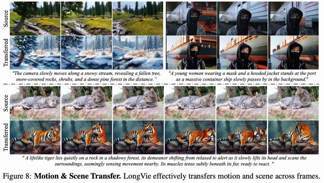 下图 8 展示了动作和场景迁移的结果,表明 LongVie 能够处理复杂的动作和场景变换。此外,