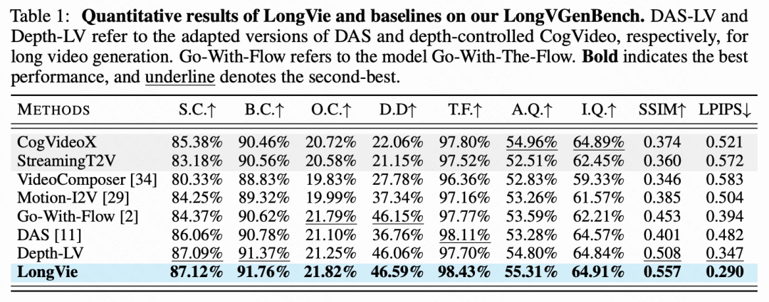 实验结果。 下表 1 中的定量结果表明,LongVie 在所有基线模型中实现了最佳的时间一致性和可控性,达到了最先进的性能。