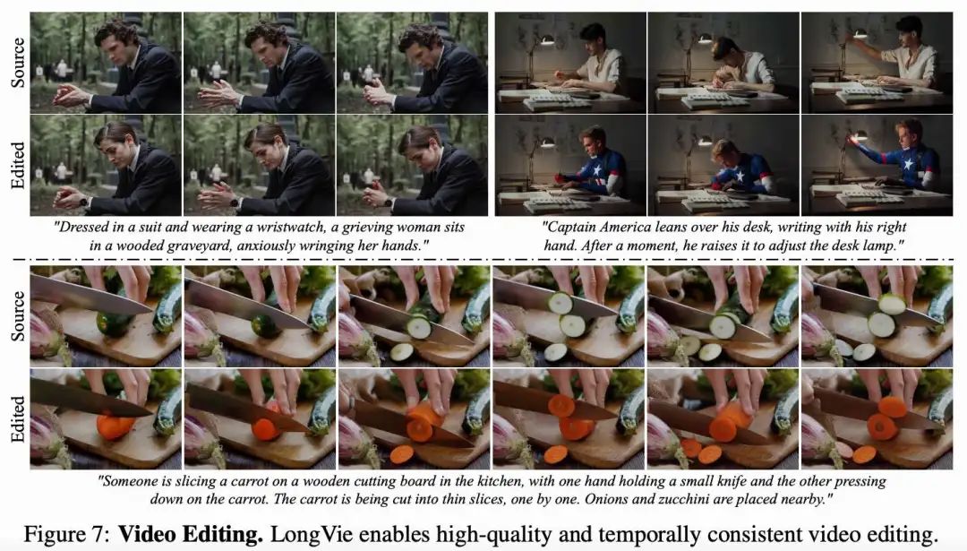 为了进一步展示 LongVie 在可控长视频生成方面的有效性,本文在下图 7 中展示了视频编辑结果,LongVie 能够忠实地替换指定的目标角色或物体。