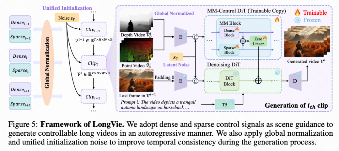 为了解决上述挑战,提出了LongVie——一个用于可控长视频生成的框架,如下图5所示。模型的核心是一个多模态框架,结合了稠密和稀疏控制,有效地引导场景生成。