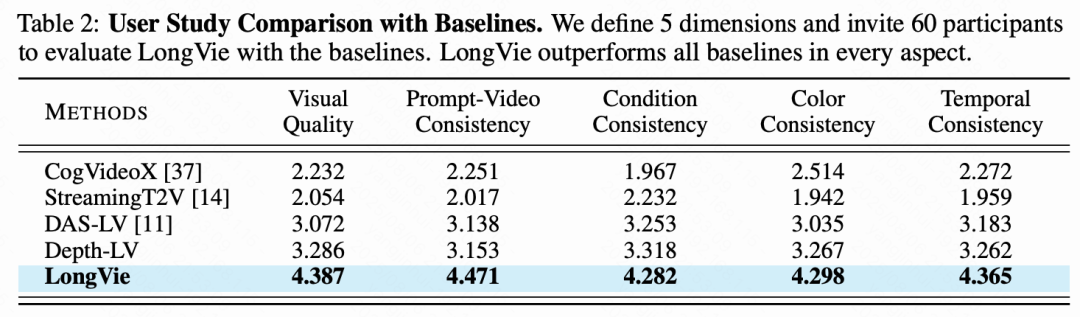 用户研究。 为了全面评估各模型,本文精心设计并开展了一项主观用户研究。为了减轻参与者的疲劳,本文对评估流程进行了相应设计。从生成的视频中,本文随机选择了 80 个样本,每个样本都配有相应的提示词和控制信号。评估聚焦于五个关键方面:视觉质量(Visual Quality)、提示词与视频一致性(Prompt-Video Consistency)、条件一致性(Condition Consistency)、颜色一致性(Color Consistency)以及时间一致性(Temporal Consistency)。本文比较了五个模型:CogVideoX、StreamingT2V、DAS-LV、Depth-LV 和 LongVie。共邀请了 60 名参与者。对于每个评估维度,参与者对五个模型的输出进行排序,最好的赋 5 分,最差的赋 1 分。所有评估的平均得分汇总于下表 2。如图所示,本文提出的方法 LongVie 在所有评估标准中均获得了最高分。