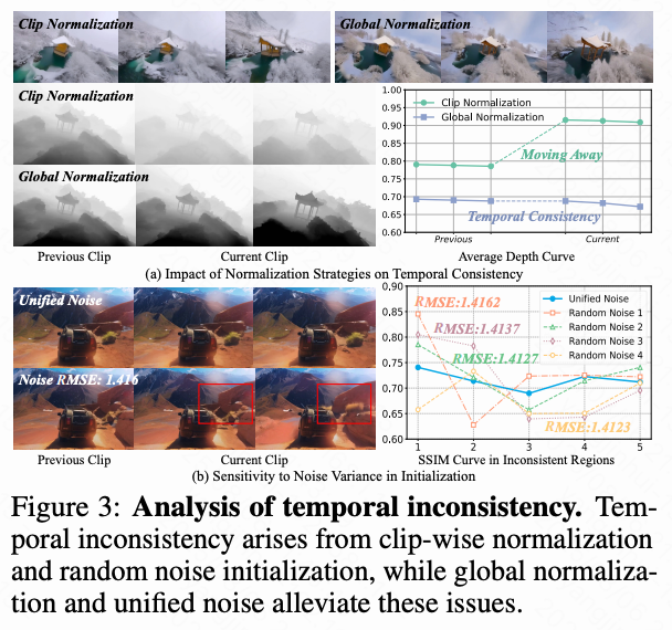 受到本文对控制信号归一化分析的启发,本文进一步研究了噪声初始化对时间一致性的影响。在基于扩散的视频生成中,初始噪声在决定输出的整体结构和运动方面起着关键作用。本文观察到,时间不一致性经常出现在每个生成片段的开头,表明噪声初始化与时间扰动之间存在强相关性。在标准的自回归生成中,每个片段都从不同的随机噪声输入中采样。这种变化在片段之间引入了运动、外观或场景布局的不一致性,即使控制信号保持对齐。本文的实证研究(见上图3 (b))验证了这一效应:与第一个片段相比,初始化噪声差异(通过均方根误差 RMSE 衡量)较大的片段,更容易表现出明显的时间不一致性,如上图3 (b) 中的结构相似性指数(SSIM)曲线所示。