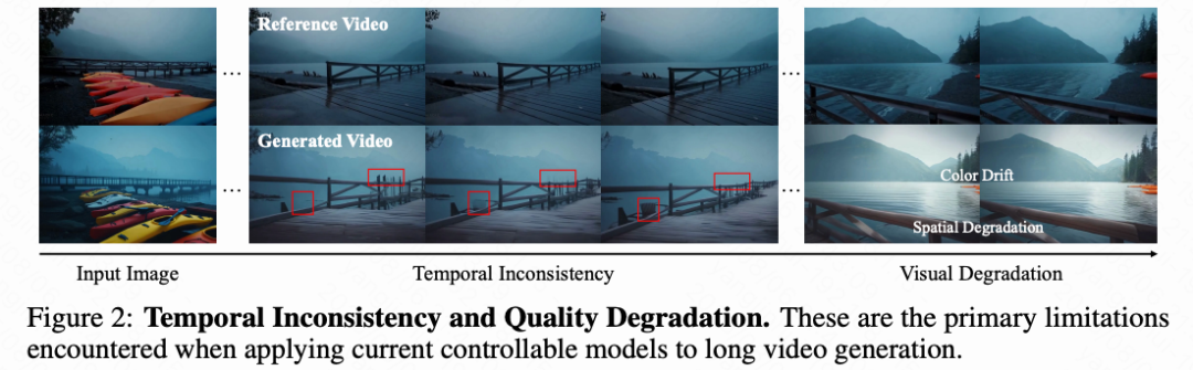 总之,长视频生成中的时间不一致性主要由片段之间未对齐的控制信号和初始化噪声的变化引起,这两者都会破坏运动和外观的连续性。