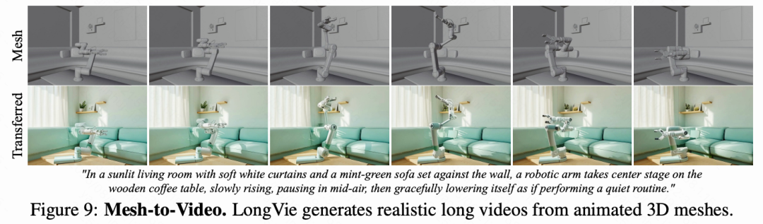 可控的 Mesh 到视频生成。 LongVie 能够从无纹理的动画 3D 网格生成长视频。本文在 3D 引擎(例如 Blender)中渲染网格以生成动画。使用 depth-to-image 模型合成初始风格化帧,并从动画中提取深度图和点轨迹。这些信号引导 LongVie 生成连贯、高质量的视频,使动画 3D 资产能够无缝集成到真实感领域中。
