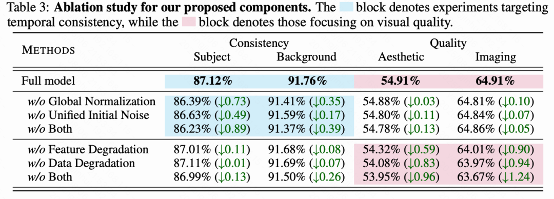 统一噪声初始化。 为进一步增强时间一致性,本文在生成过程中对所有视频片段使用共享的噪声初始化。本文不再为每个片段单独采样噪声向量,而是采样一个统一的噪声实例,并将其应用于整个序列。该统一噪声作为一致的潜在先验,减少了由独立采样噪声引起的相邻片段之间的变化。如上图 3(右下)所示,这种方法显著提升了时间连贯性,缓解了闪烁现象,并促进了生成视频中的平滑过渡。