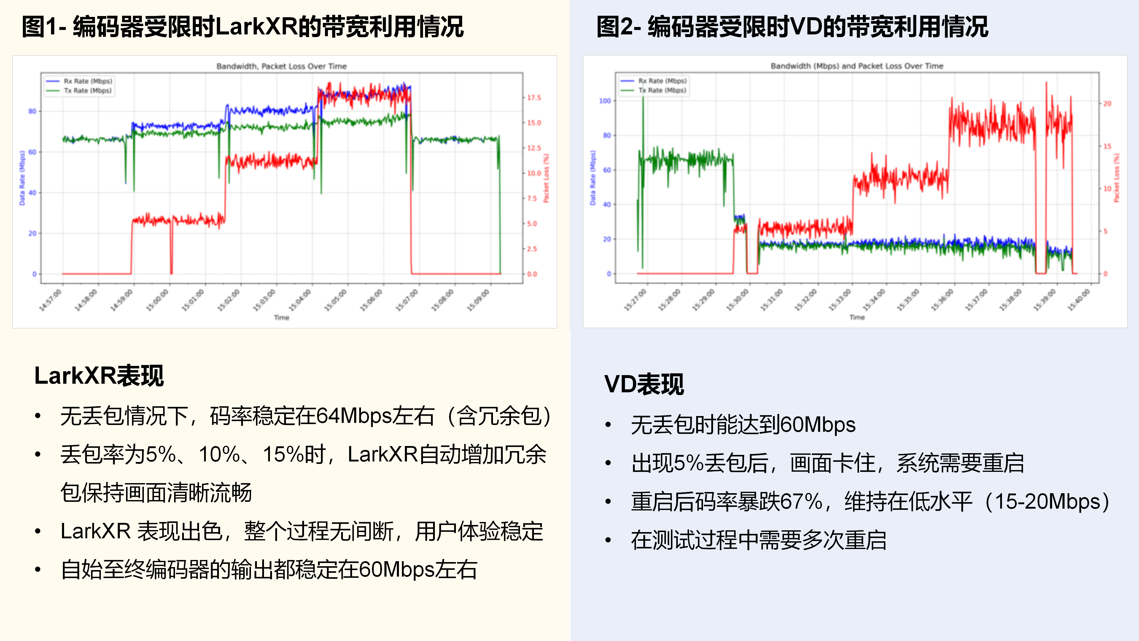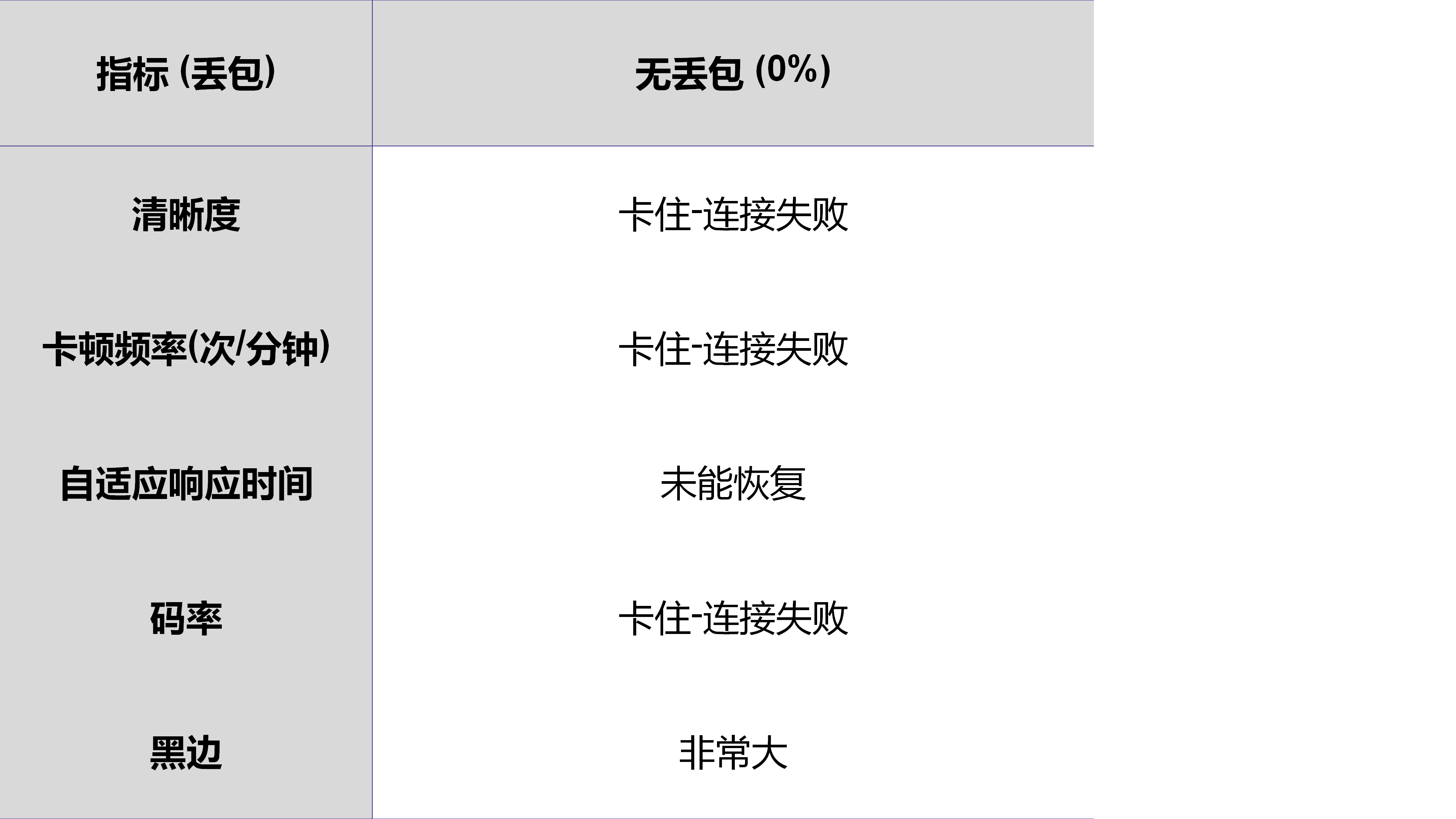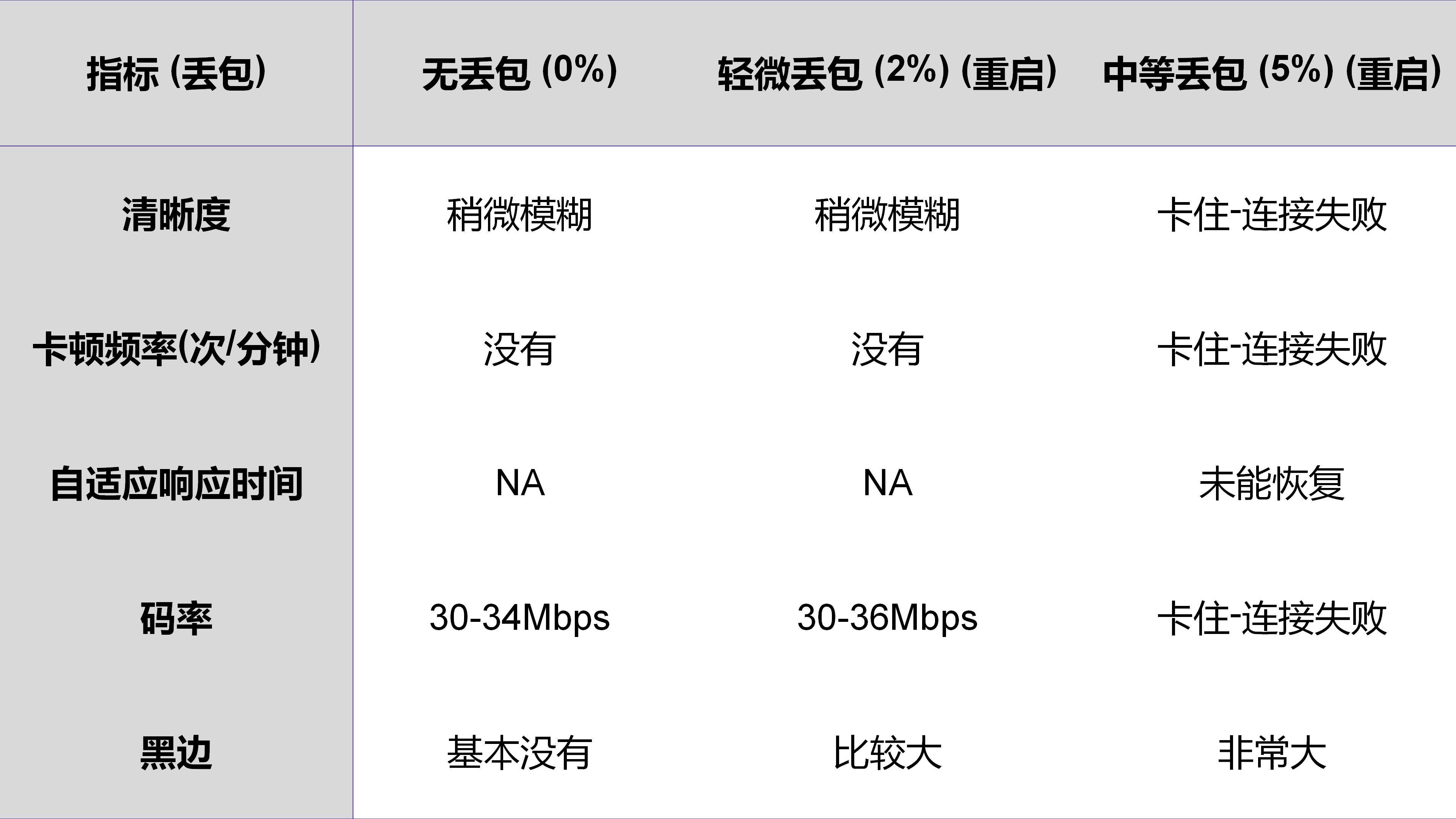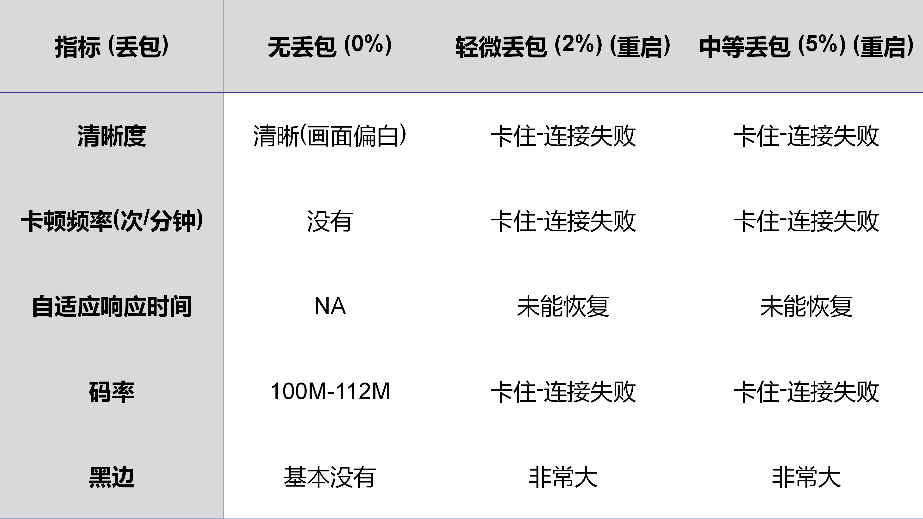 结论: 当带宽小于编码器设置时,系统完全不可用。这表明产品是恒定按照眼镜设置的码率输出,几乎没有网络自适应功能,严重依赖用户主观设置编码器码率。一旦设置的码率高于网络实际带宽,产品就无法使用,极大挑战用户耐心。