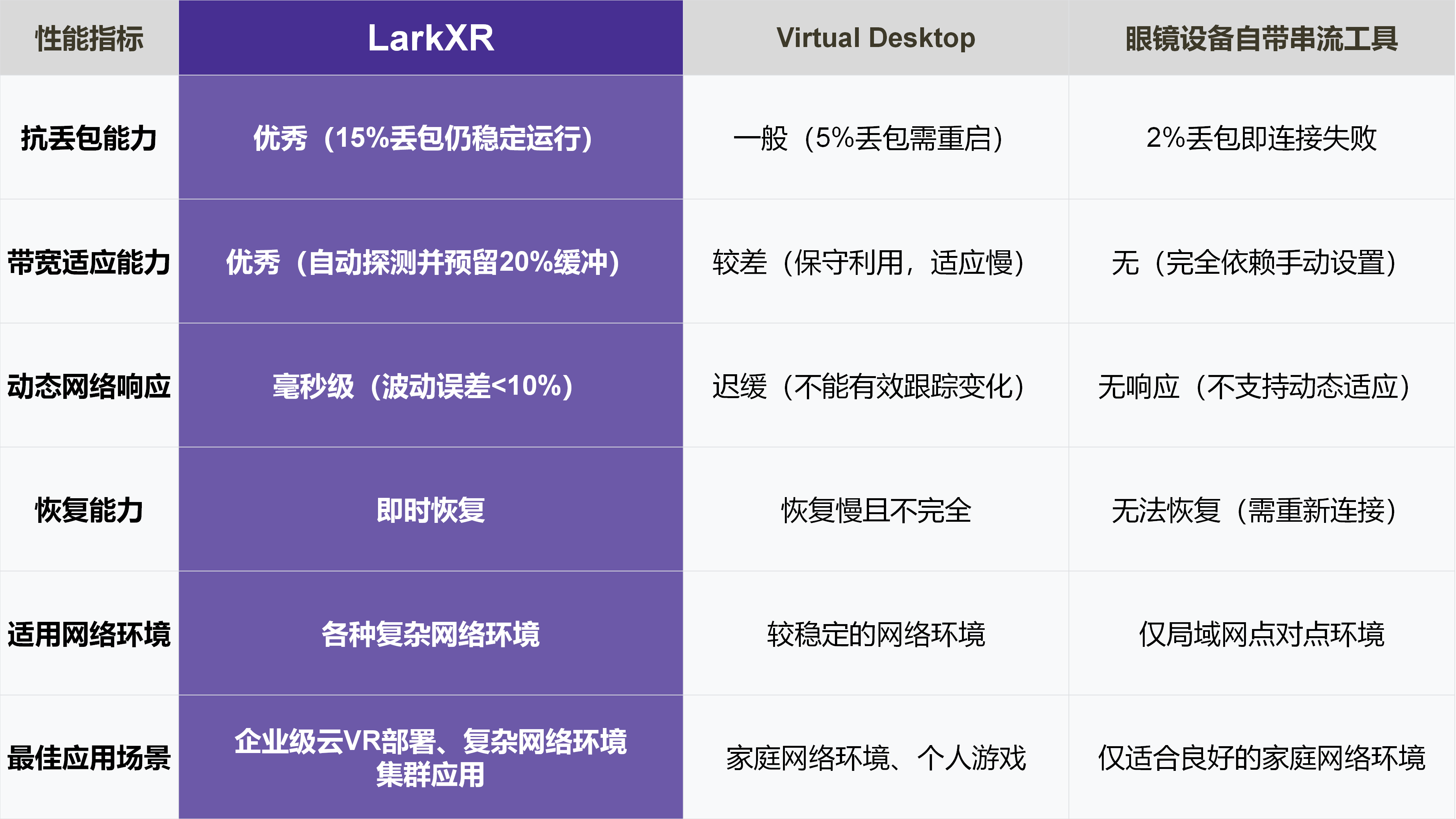 除了VD外,对市场上其他几款眼镜设备自带的串流工具产品也进行了测试。在这些简单的网络场景下,这些产品几乎都不具备高可用性,测试结果如下: