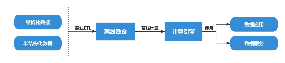 这是比较传统的一种方式,结构或半结构化数据通过离线ETL定期加载到离线数仓,之后通过计算引擎取得结果,供前端使用。这里的离线数仓+计算引擎,通常是使用大型商业数据库来承担,例如Oracle、DB2、Teradata等。