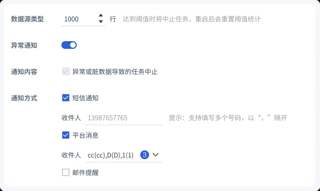 提供统一的错误队列管理、预警机制、日志管理,支持脏数据阈值设置和通知功能,可通过短信、邮件、平台消息等进行消息提醒,保证企业敏感数据的安全性。