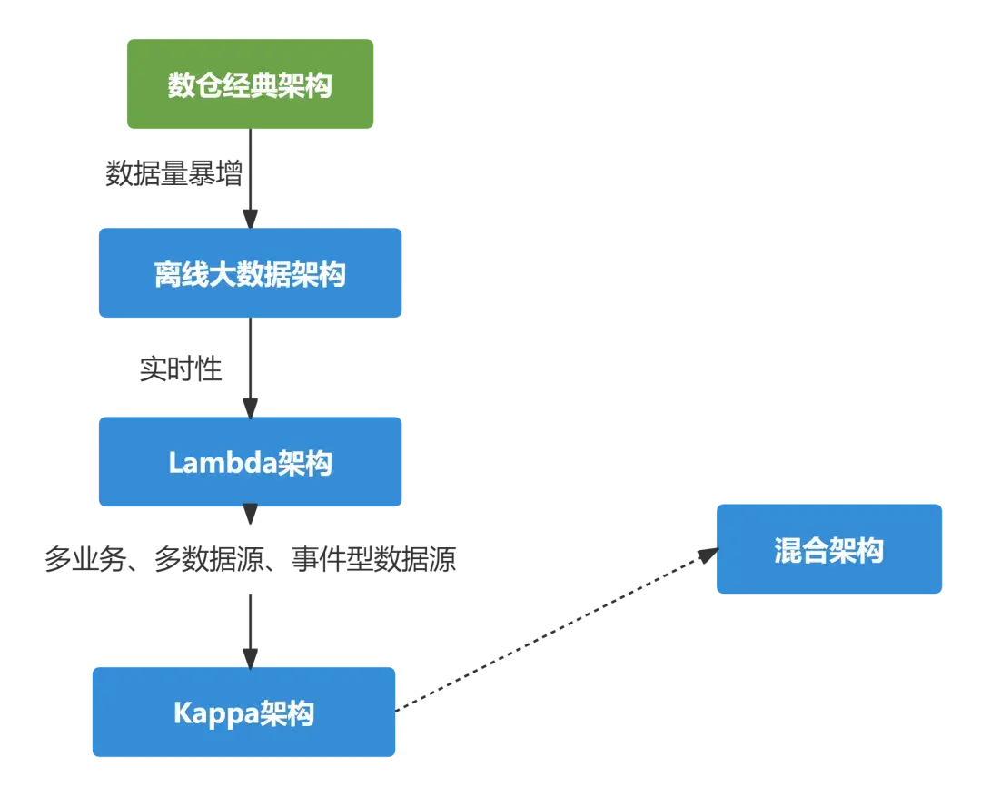 从1990年 Inmon 提出数据仓库概念到今天,数仓架构经历了最初的传统数仓架构、离线大数据架构、Lambda 架构、Kappa 架构以及由Flink 的火热带出的流批一体架构,数据架构技术不断演进,本质是在往流批一体的方向发展,让用户能以最自然、最小的成本完成实时计算。