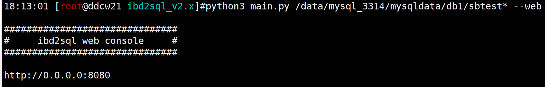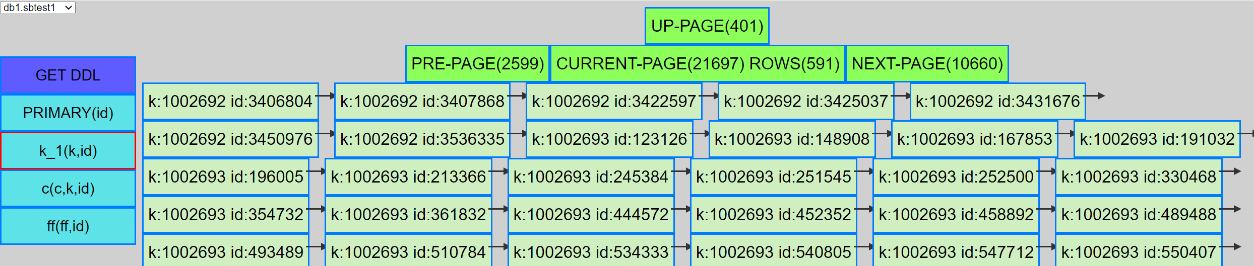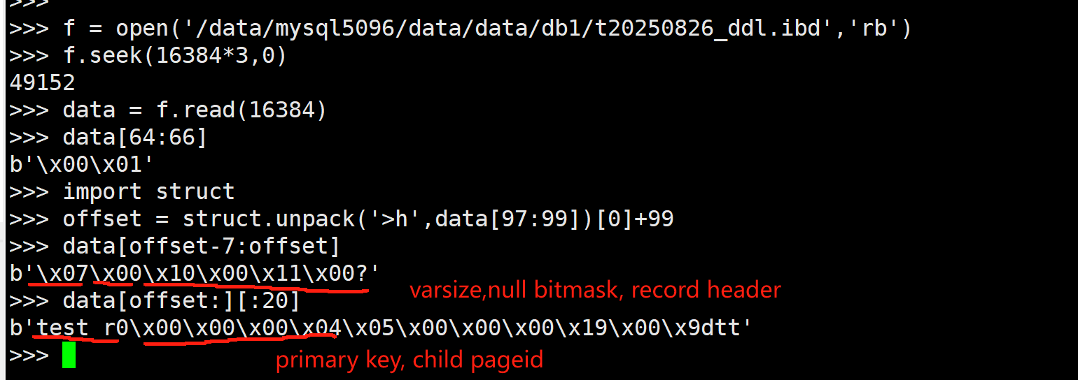 print(f"insert into db1.t20250826_ddl values('tt{i}',{','.join([ str(x) for x in range(8)]) });")然后我们可使用如下脚本快速解析数据文件, 5.x版本没有sdi, 所以主键的root page是在pageid=3的位置.