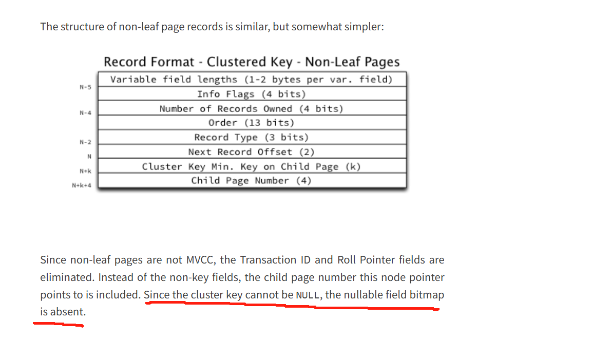 在整理innodb数据存储格式的时候, 发现有位大佬的博客 中说: 主键非叶子节点 不需要记录null bitmask.