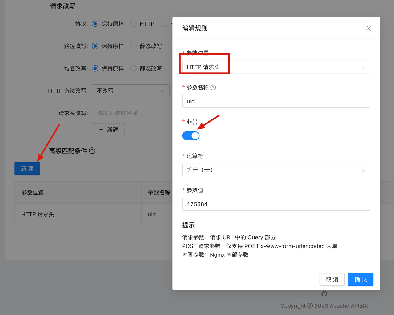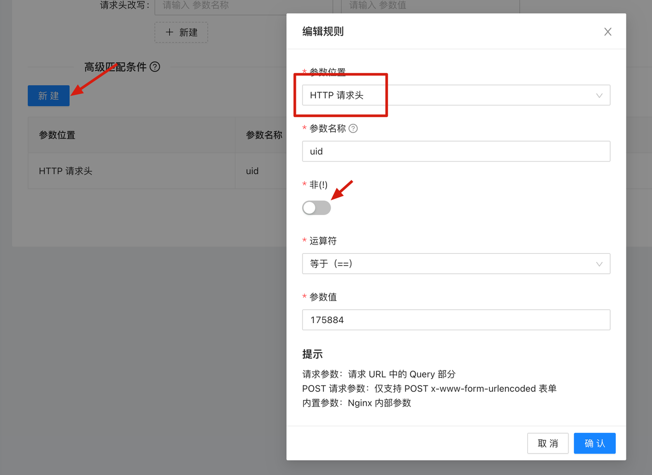 高级匹配条件这里可以填写要路由到灰度机器的uid,支持uid列表。上游服务选择step1新建的上游。点击确认提交。