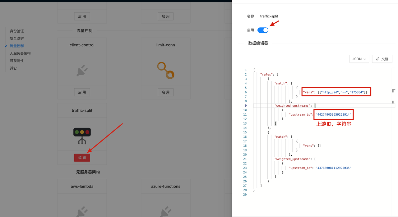 在插件配置这里选择traffic-split(流量分割)插件,点击启用,输入如下配置。